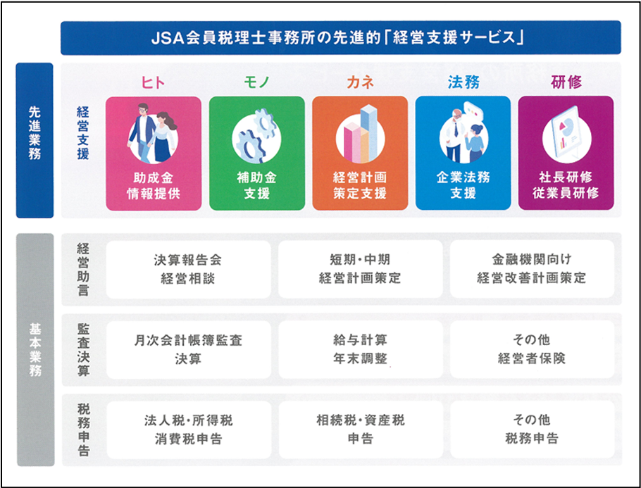 現在JSAでは、税理士の顧問先の中小企業に対する「企業法務支援」をはじめ「補助金」「助成金」「経営計画策定」「研修」等の支援サービスを実施しています。